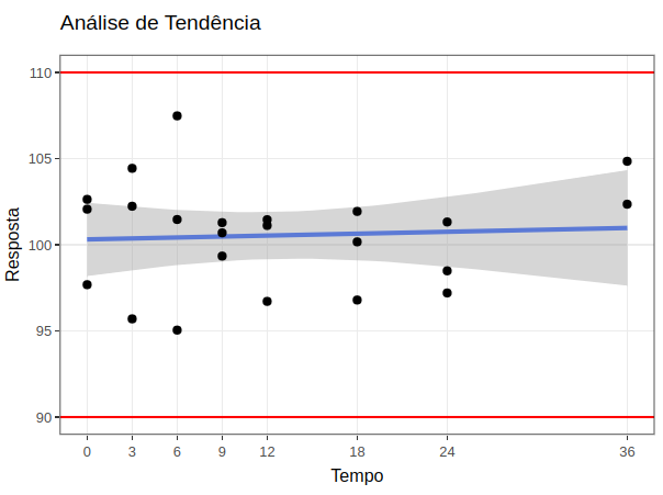 [!IMPORTANT] Tempo de prateleira é o tempo no qual o intervalo de confiança para a resposta média toca o limite de especificação. Para se determinar o tempo de prateleira, precisa-se determinar o tempo no qual o intervalo de confiança (95%) para a resposta média toca a especificação.
