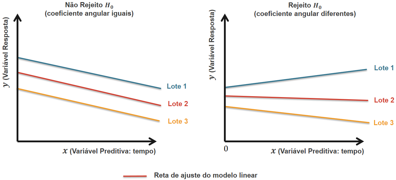 As hipóteses acima dizem respeito ao paralelismo das retas de regressão, em outras palavras, caso a hipótese nula ($H_0$) não seja rejeitada é possível dizer que todos os lotes possuem uma mesma tendência.